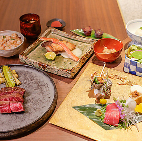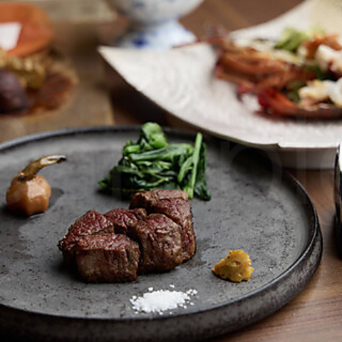 伊勢海老などの海の幸、四季折々の焼き野菜といった山の幸、そして花乃牛(ヒレ・ロース合計100g)を一度にお楽しみいただける、贅沢なコースをご用意しております。ビジネスでの接待や、大切な方へのおもてなしにもおすすめです。
