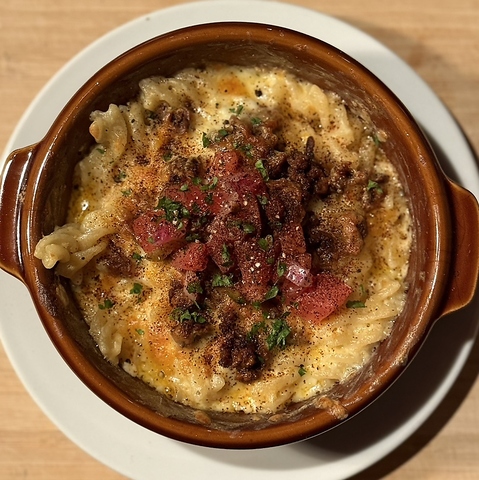 濃厚チーズが洪水のようにとろけてマカロニに絡みつく、究極のごちそうマカロニチーズ!香ばしい余韻が口いっぱいに広がり、一口食べればもう止まれない。心もお腹も満たす、至福の一皿。