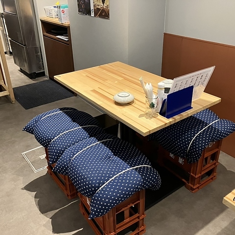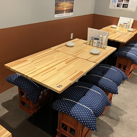 お酒のケースをリメイクした遊び心たっぷりの座席がお出迎え♪酒瓶ケースを土台に、ドット柄のクッションが敷かれた、カジュアルながらも可愛らしさもある目を引くインテリアになっています!ふかふかのクッションなので、長時間座っても疲れにくい仕様です◎リラックスしながら、本格的で美味しい佐賀の料理と地酒をお楽しみください!