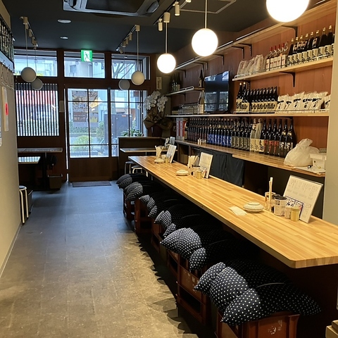 お一人様やデートに大人気のカウンター席◎お仕事帰りにサクッと飲みたい時や、大切な方とじっくり語り合いたい夜にもぴったりのお席です。スタイリッシュな空間で、自分たちだけの特別な時間をお過ごしいただけます。壁一面の棚には、選りすぐりの焼酎や日本酒のボトルが美しく並べられており、お酒を選ぶワクワク感も◎