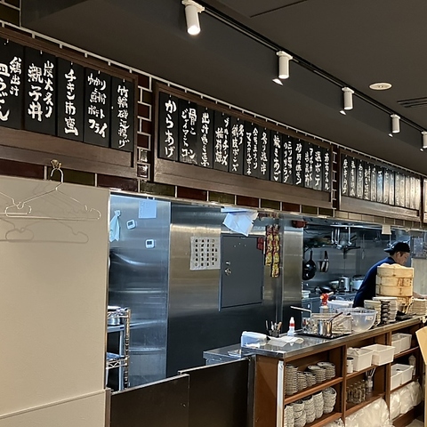 【オープンキッチン】安心感と活気のある、調理の様子が見える開放的なキッチンになっています!壁には手書きのお品書きが並び、ワクワクする空間です♪次々と仕上げられる料理を眺められるライブ感があります!清潔感あふれる厨房が自慢。お仕事帰りのサク飲みから、ご友人同士の賑やかな飲み会まで◎