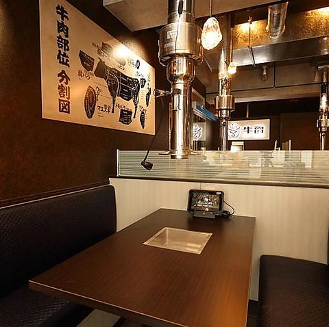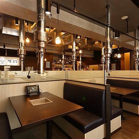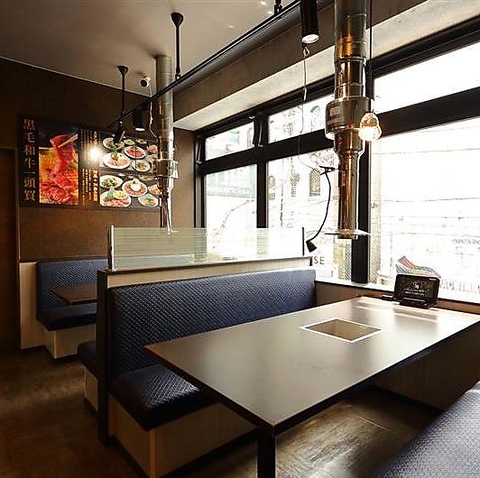 温かみのある間接照明とダークトーンの壁が広がる、落ち着いた雰囲気のテーブル席。ゆったり配置された座席で周囲を気にせず会話を楽しめ、デートや同僚との食事にも最適です。無煙ロースター完備で煙を気にせず快適に焼肉を堪能可能。大切なひとと過ごす時間をやさしく包み込む、居心地の良い焼肉空間です。