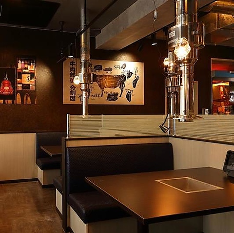 温かみのある間接照明とダークトーンの壁が広がる、落ち着いた雰囲気のテーブル席。ゆったり配置された座席で周囲を気にせず会話を楽しめ、デートや同僚との食事にも最適です。無煙ロースター完備で煙を気にせず快適に焼肉を堪能可能。大切なひとと過ごす時間をやさしく包み込む、居心地の良い焼肉空間です。