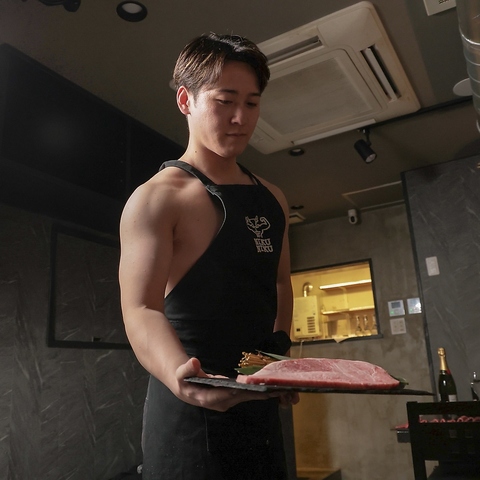 筋肉ムキムキのスタッフがエプロン姿でお出迎え。非日常感たっぷりの接客と上質な焼肉で、特別に一日に♪