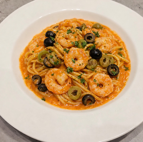 プリッとした海老の旨みを引き出し、オリーブの程よい塩味と香りを重ねたトマトクリームソース。トマトの酸味とクリームのコクが絶妙に溶け合い、口に運ぶたびに深みのある味わいが広がります。最後まで飽きずに楽しめる、食事にもお酒にも寄り添う贅沢な一皿です。締めにもおすすめ。