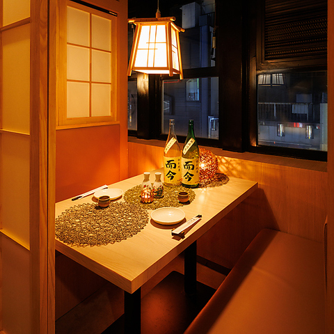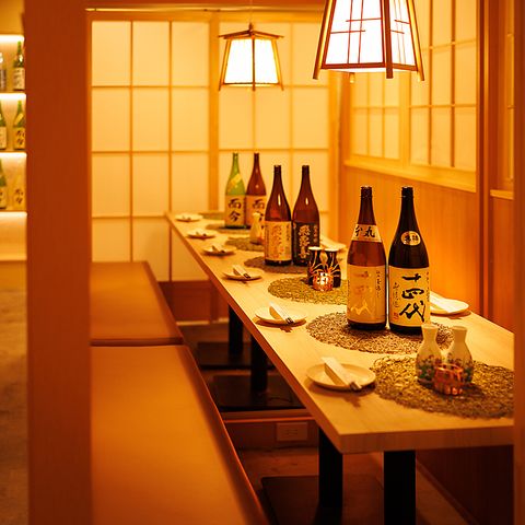 障子や木の温もりを活かした和モダンな個室空間は、周囲を気にせずゆっくりと食事を楽しめる落ち着いた雰囲気。やわらかな照明が心地よく、会話と料理に自然と集中できる設えです。デートや記念日、少人数での会食にも最適で、料理や日本酒の魅力をより一層引き立てます。居心地の良さにこだわった、大人のための上質な空間です。