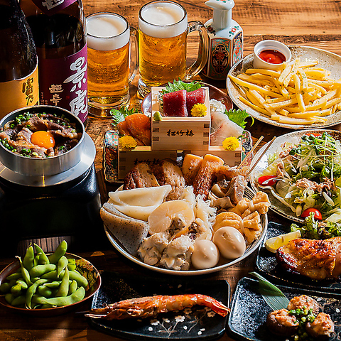 季節の味をバランスよく楽しめる彩コースは、朝〆鮮魚のお造り三種や旨味出汁が染みたおでん盛り合わせなど、和の逸品を中心に揃えた満足度の高い内容。特製だれ唐揚げや香ばしく焼き上げた鮭ハラスなど、食べ応えのある料理も魅力です。締めには海鮮だしを効かせた塩焼きそばをご用意。3時間飲み放題付きで、宴会や飲み会にも使いやすいお得なコースです。