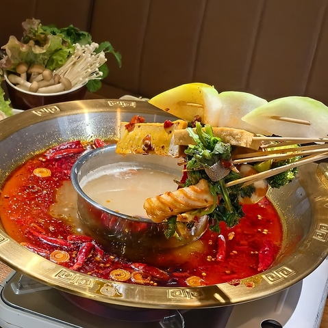 1つの鍋で2種類のスープが同時に楽しめる当店人気のスタイルです。