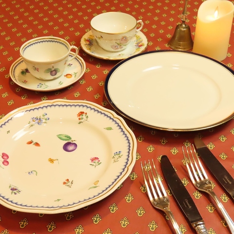 フランス製の食器に美しく盛り付けられた料理は、旬の野菜や果物をふんだんに使用しています。落ち着いた雰囲気の中で、四季折々の味わいをどうぞお楽しみください♪