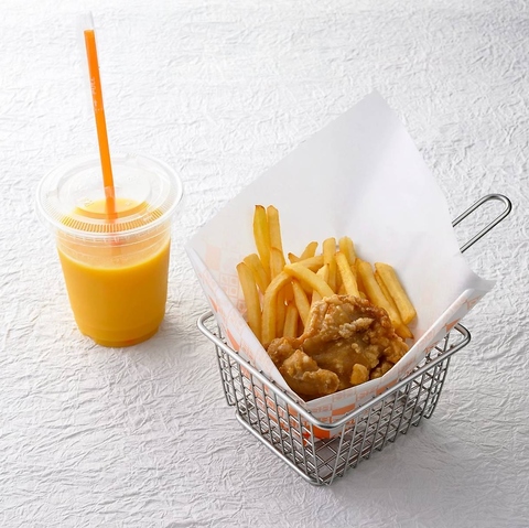 ○鶏の唐揚げ1個 ○ポテトフライ100g ○選べるドリンク[アイスコーヒー/オレンジ/ほうじ茶/玄米茶]