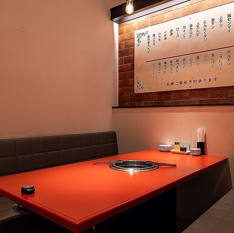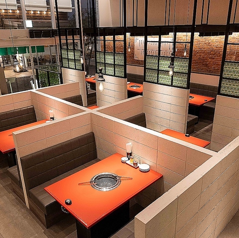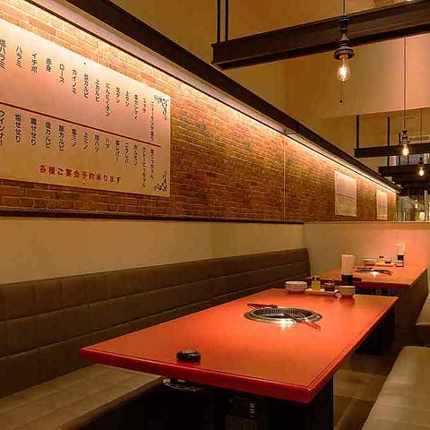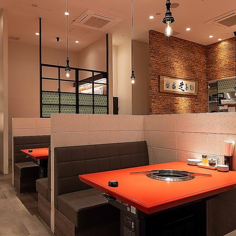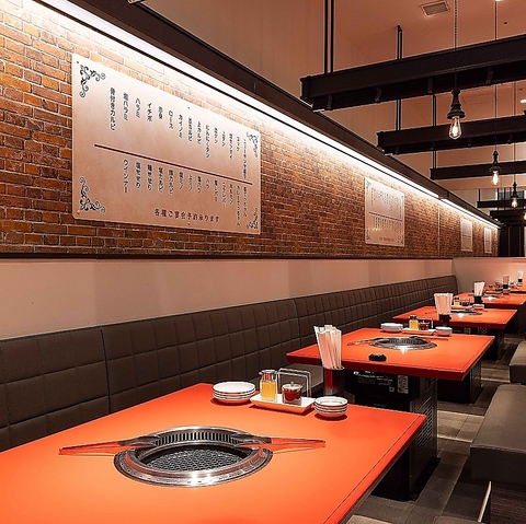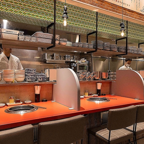 【店内空間】どこか懐かしさを感じる町焼肉の佇まいを残しつつ、今の時代に合わせた心地よさを備えた店内です。お一人様に人気のカウンター席ございます。無煙ロースター完備で、食事の時間を快適にお楽しみいただけます。