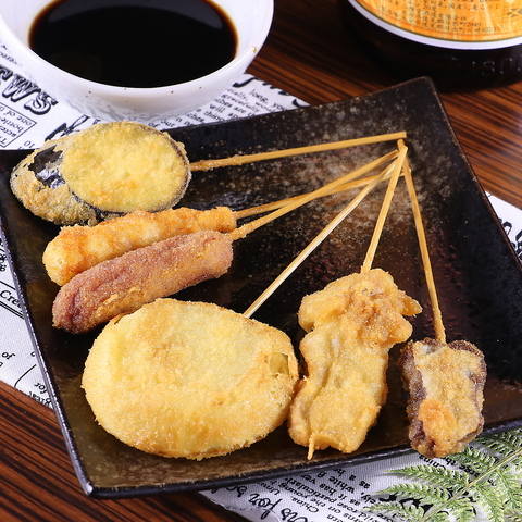 牛、豚、えび、野菜など、様々な食材を食べやすく串に刺してカラリと揚げた「串カツ」お酒のお供にぴったりです☆仕入れ状況により内容はおまかせです。アツアツを召し上がれ♪