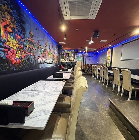 異国情緒あふれる空間デザインで、非日常的な気分を味わえる店内◎開放感のある広々としたテーブル席は、普段のランチやお仕事帰りのちょい飲み、女子会・合コン・パーティーなど、幅広いシーンでご活用いただけます。