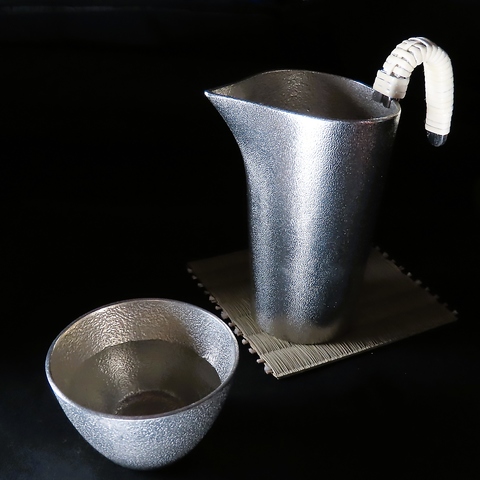 【素材のコントラスト】 凛とした冷たさを湛える「銀の徳利」で愉しむ日本酒。一方、焼酎は掌に馴染む「土の陶器」で。温度と質感の対比が、一献の価値を高めます。