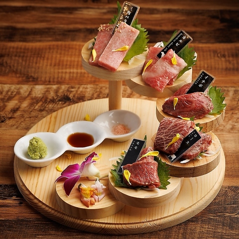 きれいなサシが佐賀牛の一番魅力です!【上品な脂の甘味】と【肉本来の旨味】が特徴です。様々な部位を少しずつ楽しめる目でも味でも楽しめる1皿。佐賀の牧場と直接取引しているため、新鮮な佐賀牛を安価で仕入れたことによりこの価格でご提供ができております。自信のある1品です!3種盛り合わせもご用意しております♪