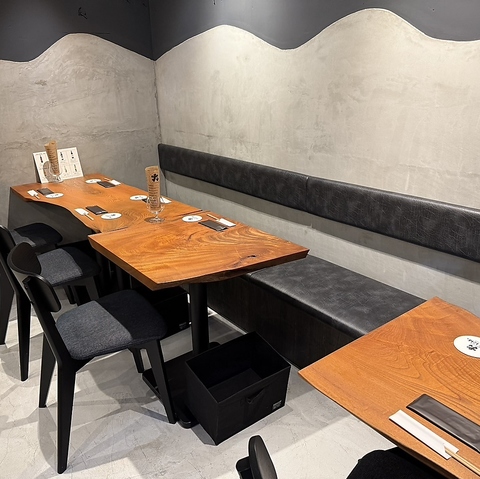 木の温もりを感じるカウンター席は、落ち着いた雰囲気の中でゆったりと過ごせる空間。1~4名までご利用いただけるため、お一人さまはもちろん、気の合う仲間との食事にもぴったりです。目の前で調理される様子や炭火の香りを感じながら、会話と料理を楽しめる、ほどよい距離感が心地よい席となっています。