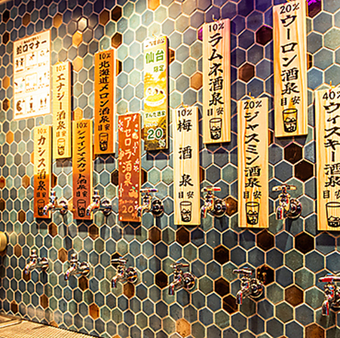蛇口をひねればお酒が出てくる!! 壁一面の蛇口からお酒が流れ出る、銭湯×居酒屋ならではのユニーク体験。好きなドリンクを注いで乾杯!