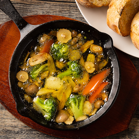 厳選した素材の旨味がオイルに溶け出し、一口ごとに深い味わいが広がります。プリプリの具材を楽しんだ後は、その旨味が凝縮されたオイルをバゲットにたっぷりと浸して。最後の一滴までお酒が止まらなくなる、至福の逸品をご堪能ください。