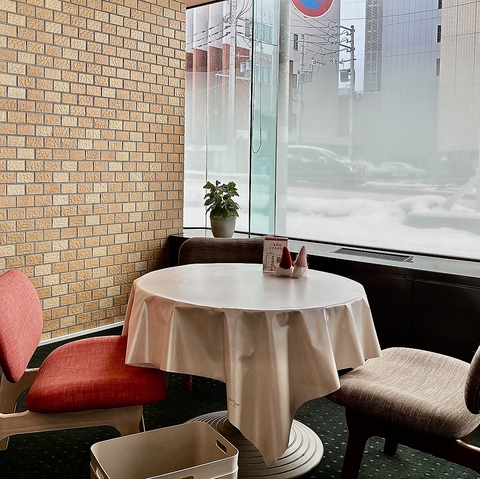 【テーブル席】店内、奥の窓側のお席には、丸テーブルとゆったりとしたくつろげるイスで4名様6名様グループでのご利用にも最適!「会社の飲み会」やイベント後の「二次会」などまた、おしゃべりのはずむ「女子会」など。ゆったりとお寛ぎください☆