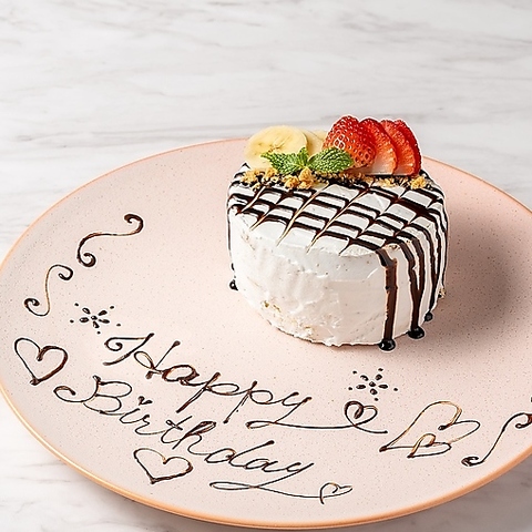 事前予約でバースデープレートご用意可能です。苺とバナナのケーキをメッセージを書いたプレートにてご提供