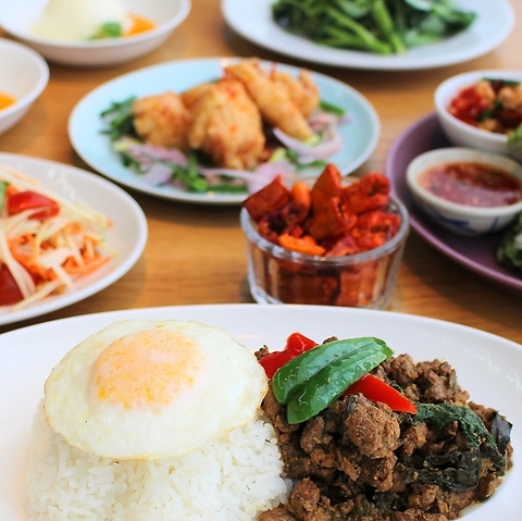 海南チキンライスやトムヤムヌードル、豚挽肉のガパオライス、肉と茄子のグリーンカレーなどなど、いろいろ自由に組み合わせられるセットメニューが人気です。 豊富なメニューを取り揃えてお待ちしています♪