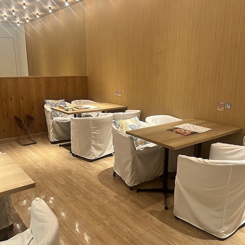 ベビーカーや車いすの方にもご利用いただきやすいお席。店内はアジアンリゾートがイメージの柔らかな空間