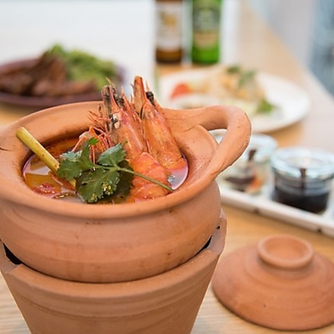 有頭エビが二尾丸ごと入ったタイ料理の定番、トムヤムクンスープです。酸味のきいたスパイスたっぷりのスープはごくごく飲み干せる、癖になる味わいです