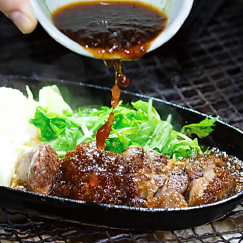 特製ダレに付けた鶏もも肉を一枚まるごと揚げた山賊焼き!