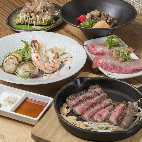 みんなで楽しむならコースをご注文ください◎イチオシは《和牛堪能コース》!和牛の炙り寿司をはじめサーロインステーキやお好み焼きなどが付いて6000円(税込)と大人気のコースです。当店の魅力が詰まった各コースを多彩なシーンでご堪能ください。