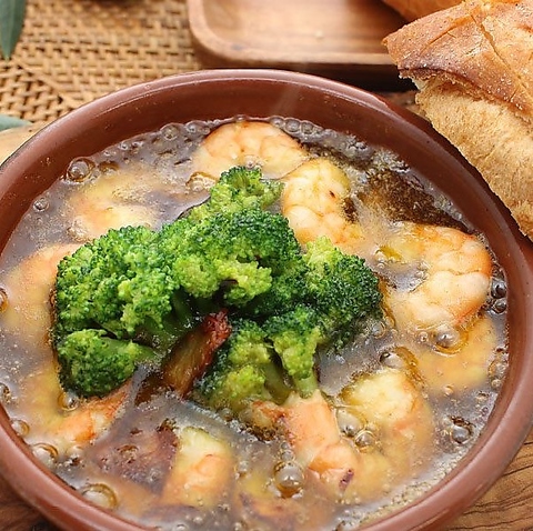 オリーブオイルの香りに包まれ、にんにくの旨みがじんわり染み込んだぷりぷりの海老と、彩り鮮やかなブロッコリー。熱々のオイルが素材の甘みを引き立て、ひと口ごとに広がる濃厚な風味は、まさに至福の瞬間。バゲットを添えて、最後の一滴まで楽しみたい、贅沢なスペイン風おつまみです。