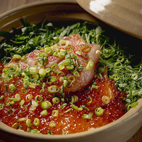 名物「金目鯛といくらの豪華土鍋飯」をメインに、市場直送の鮮魚や名古屋地鶏、肉刺しまで堪能できる贅沢なフルコースです。さらに、いくらをたっぷり乗せた出汁巻きや大エビフライなど、豪華食材が宴を彩ります。ゆったり3時間の飲み放題付きで、名駅での接待や記念日、大切な会社宴会に。大人の個室空間で至福のひと時を