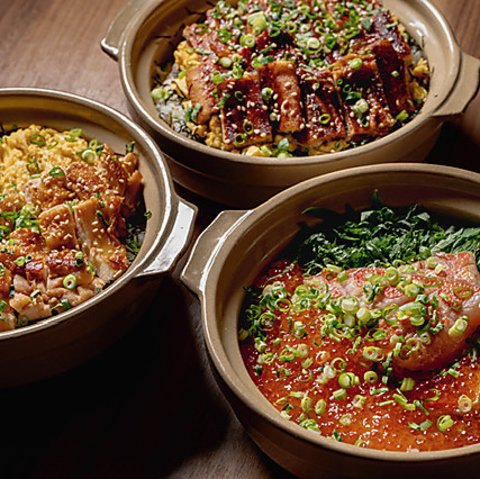 看板メニュー「土鍋飯」は、厳選した和牛や金目鯛、真鯛を使用し、一釜ずつ丁寧に炊き上げます。お米一粒一粒に素材の旨味が染み渡った炊き立ての味は格別。まずはそのまま、次に薬味を添えて、最後は出汁茶漬けで「ひつまぶし風」に。名駅エリアでの夜ご飯や、お酒の〆にも外せない自慢の逸品をぜひご賞味下さい