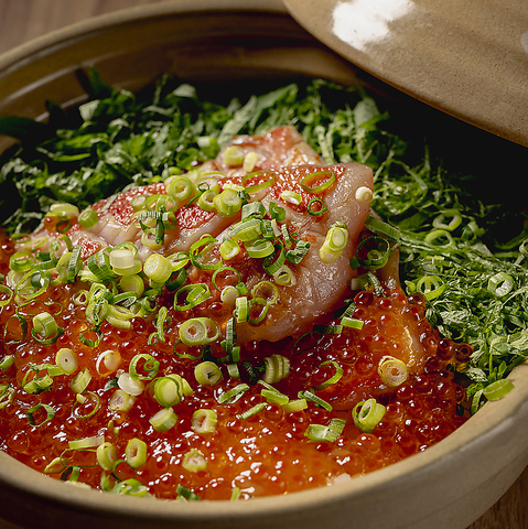 看板メニュー「土鍋飯」は、厳選した和牛や金目鯛、真鯛を使用し、一釜ずつ丁寧に炊き上げます。お米一粒一粒に素材の旨味が染み渡った炊き立ての味は格別。まずはそのまま、次に薬味を添えて、最後は出汁茶漬けで「ひつまぶし風」に。名駅エリアでの夜ご飯や、お酒の〆にも外せない自慢の逸品をぜひご賞味下さい