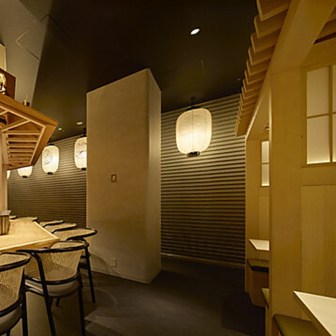 当店は、和モダンな雰囲気が漂う落ち着いた空間となっております。木材を基調としたゆったりとした店内は、大切な方とのデートや、ご友人との会食に最適です。大阪駅直結の便利な立地ながら、喧騒を忘れさせる上質な空間で、心ゆくまでお料理とお酒をお楽しみください。多様なシーンでご利用いただけます◎