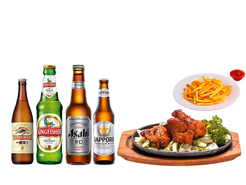 生ビール(キリン)、フライドポテト、タンドリーチキン