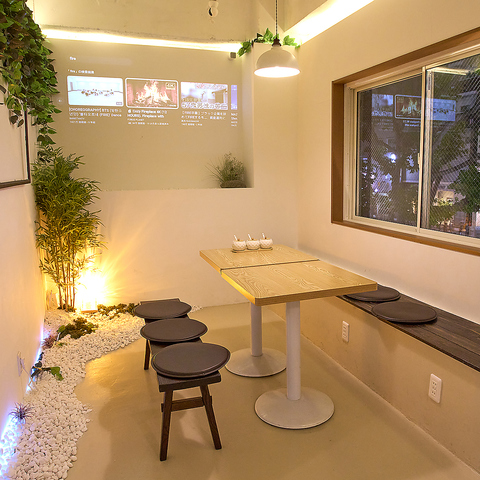 観葉植物や石庭のような装飾が、自然の温もりを感じさせる心地よい空間を作り出しています。大きな窓からは外の景色も眺められ、開放感も抜群です。プロジェクターでの映像演出も可能で、ゆったりとした時間が流れる中で絶品料理を堪能いただけます。日常の食事を少し特別にする、癒やしのひとときをお過ごしください。