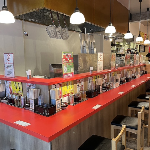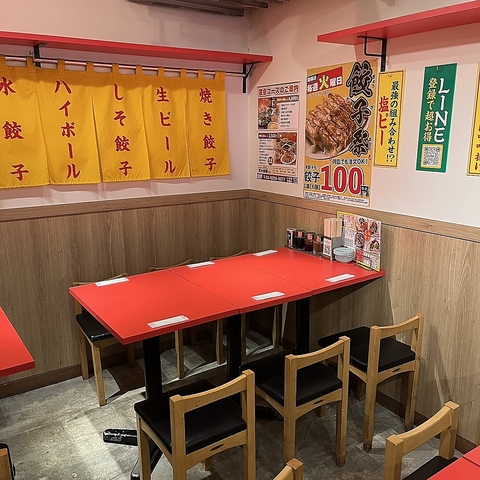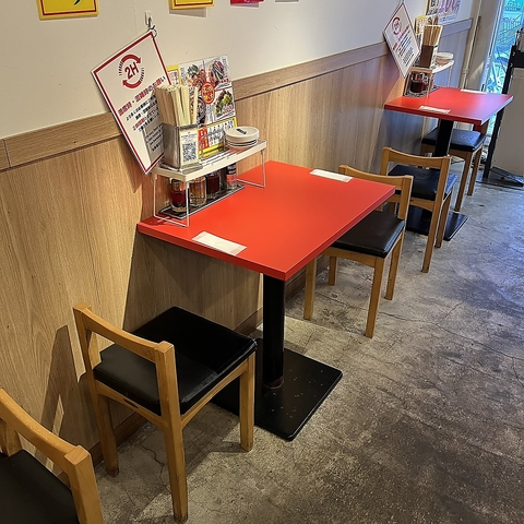【宴会受付大歓迎!】現在は店内は赤くリニューアルされてます!グループでの宴会や大人数でのお食事に便利なテーブル席もございます♪広々とした6名様がけのテーブル席が2席あり、最大で12名様までご利用可能です。部署の飲み会や家族での集まりなど、様々なシーンでご利用いただけます♪