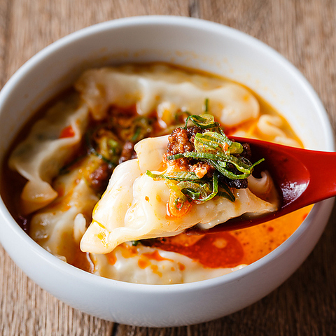 もっちり食感の水餃子を、香ばしい胡麻のコクとピリ辛ラー油を効かせた特製坦々スープで仕上げた一品。濃厚ながらも後味はさっぱりで、ひと口食べれば胡麻の風味と肉汁の旨味が口いっぱいに広がります。前菜にも〆にもおすすめの、女性人気も高い名物メニューです◎