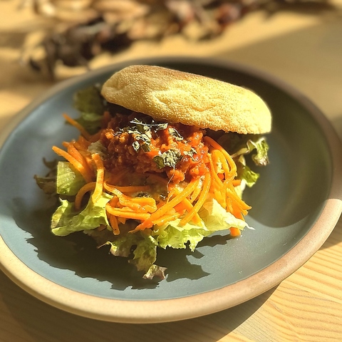 豆乳と甘酒で引き出した、やさしい甘みともっちりとした食感が魅力のバンズに、日替わりの具材と自家製ソースをサンドしました。ふんわりもちもちのバンズと具材の組み合わせは、当店のスペシャルティコーヒーとも相性抜群。朝のひとときをやさしく彩り、思わずコーヒーが飲みたくなる一品です。