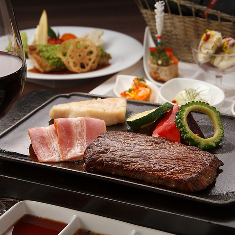 目の前の鉄板でシェフが鮮やかに腕を振るう、ライブ感あふれる美食体験。香ばしい音と香りが食欲をそそるメインディッシュに加え、全コースにお好きなだけ愉しめる豪華ブッフェがセットに。島野菜や旬の味覚を心ゆくまで堪能できる、満足度の高いひとときをお約束します。オーシャンビューの絶景と共に、至福のディナーをどうぞ。