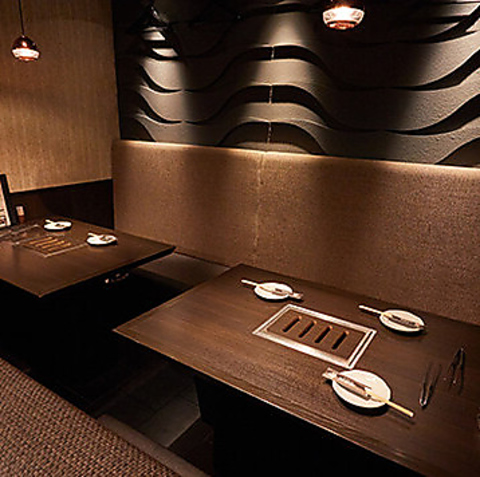 池袋西口の喧騒から少し離れた場所にある店内は、モダンで落ち着いた色調で統一された大人の隠れ家のような雰囲気です。温かみのある照明が心地よく、大切な人との会話を静かに楽しみたい夜にぴったり。各テーブルには最新の排気設備も整っており、匂いを気にせず快適にお食事ができるのも嬉しいポイントです。