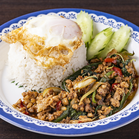 熱々のご飯の上に、香り高いバジルと炒めた肉をたっぷりのせたタイ料理の代表格です。にんにくと唐辛子の刺激的な香りが食欲をそそり、ナンプラーの旨味が全体を力強くまとめます。仕上げに添えられる半熟の目玉焼きを崩すと、とろりとした黄身が辛味を包み込み、コクが一気に広がります。