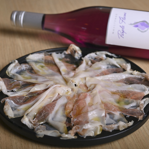 お酒のお供に最適な「黒豚諫美豚プレミアム生ハム」。噛むたびに溢れ出す濃厚な肉の旨みを存分にご堪能いただけます。その他にも「黒豚諫美豚プレミアム生ハムとチーズのサラダ」などの一品もご用意しております。手間暇かけて仕上げた自慢の逸品を、ぜひお好みの一杯とともに心ゆくまでお楽しみください◎