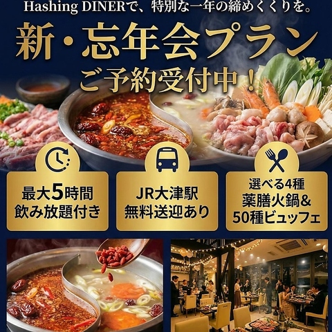 新・忘新年会にも最適な、最大5時間飲み放題付きのプランをご用意しております♪身体の中からポカポカ温まる本格的な薬膳火鍋は4種類からお選びいただけて、50種類のビュッフェも魅力のひとつ。30名様から貸切対応も可能で、音響・マイク・映像設備も完備しておりますので、心ゆくまでご宴会をお楽しみいただけます。