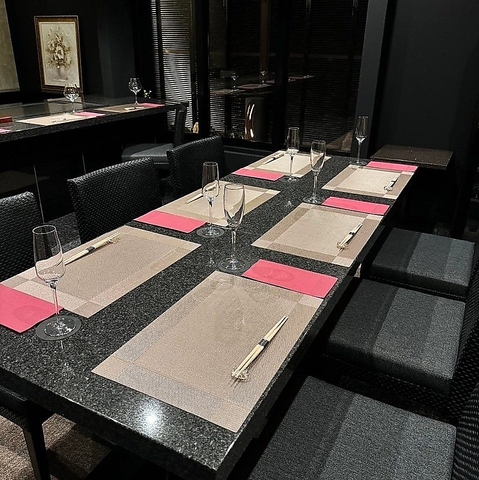 シェフが繰り広げる職人技を、目の前で楽しめるカウンター席が人気です!メインフロアに5席、別フロアに4席をご用意。小さなお子様連れの方は、少し離れた場所から調理を眺められるテーブル席がおすすめ。プライベート感のあるBOX席など、様々なお食事のシーンに対応します。