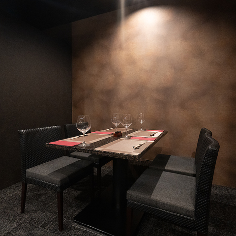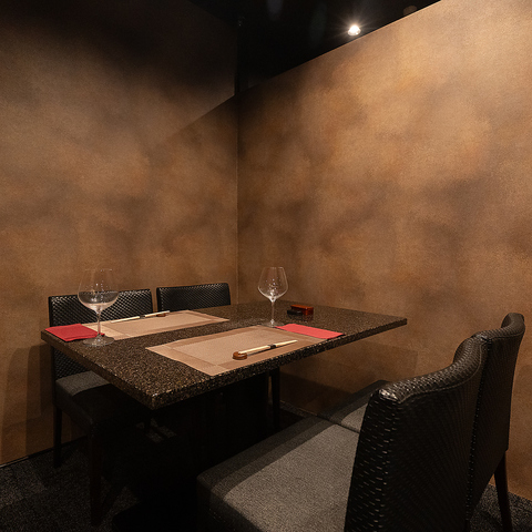 鉄板前のカウンター4席、テーブル8席を完備。両家顔合わせなど、大切な場面にも適しています◎極上のステーキをご堪能いただいた後は、記念日のお客様優先で優雅なソファが並ぶデザートルームへご案内。コーヒーやデザートを楽しみつつ、ほっと一息お寛ぎ頂くことができます。