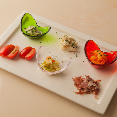 前菜の盛り合わせ(6種類:イベリコ豚の生ハム、キャロットラペ、キャベツのマリネ、キュウリのサラダ、フルーツトマト)キャロットラペには、その時の旬の無農薬の柑橘を使用しております。こだわり抜いたKokomiの生ハムは格別の美味しさです。 Kokomiでは、香りと味を楽しんで頂く為に、切り立てをお出しします。