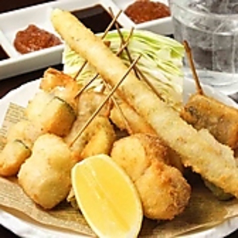 ビールのお供に最適♪お得な串揚げメニュー♪うずら、オクラ、カボチャ、イカゲソ、ちくわ、ウインナー、長葱肉巻、玉ねぎ肉巻、モチベーコン、茄子肉詰め、ピーマン肉詰めなど多彩な串揚げメニューが1本108円(税込)~ご賞味いただけます☆