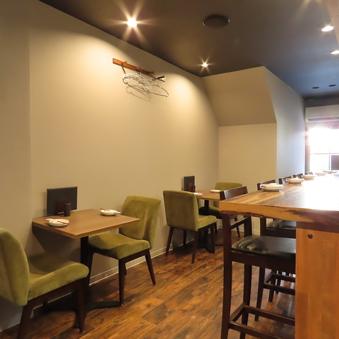 お洒落で清潔感のある店内は、デートや記念日など特別な日のディナーに最適です。お一人様でも気兼ねなく過ごせるカウンター席のほか、レイアウト変更が可能なテーブル席も完備しています。補助椅子を使用すれば10名様以上の団体利用も可能なので、会社帰りの宴会や友人同士のお集まりにもぜひご利用ください♪