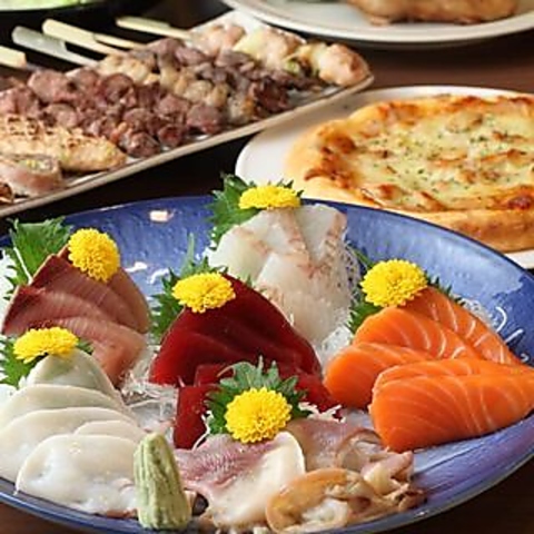 炭火焼鳥と鮮魚を楽しめる宴会コースは飲み放題付き。